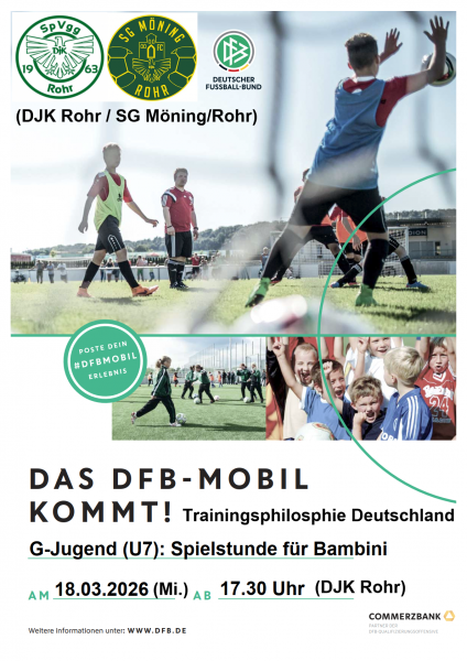 Am 15.09.2025 fand im HOB-Center des PLAYMOBIL-FunParks in Zirndorf eine Veranstaltung des Bayerischen Fußballverbandes statt zur Ehrung der Fußballmeister der Rückrundensaison 2024/2025 der Jugendmannschaften von ganz Mittelfranken. Dabei wurde die SG Möning/Rohr I auf die Bühne geholt mitsamt der Fußballkids und Trainer. Das Team durfte sich unter großem Applaus in der vollbesetzten Halle ihre gewonnen Meisterurkunde abholen. Zudem gab es noch für diesen Tag für die Mannschaft Freikarten für den Freizeitpark. Zu guter Letzt gewann die SG Möning/Rohr dann auch noch 20 freie Eintrittskarten für das Spiel vom 1. FC Nürnberg gegen Holstein Kiel in der 2. Bundesliga am 19.10.2025. Diese Losglück rundete den rundum gelungen Tag für Kinder, Eltern und Trainer vollends ab.