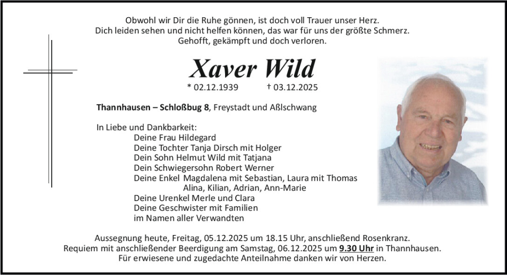 Die Aussegnung findet am Mittwoch, 29.03.2023 um 18.00 Uhr mit anschließenden Rosenkranz in der Filialkirche St. Martin in Rohr statt. Dort feiern wir dann am Donnerstag, 30.03.2023 um 14.00 Uhr das Requiem und verabschieden uns von Franz.